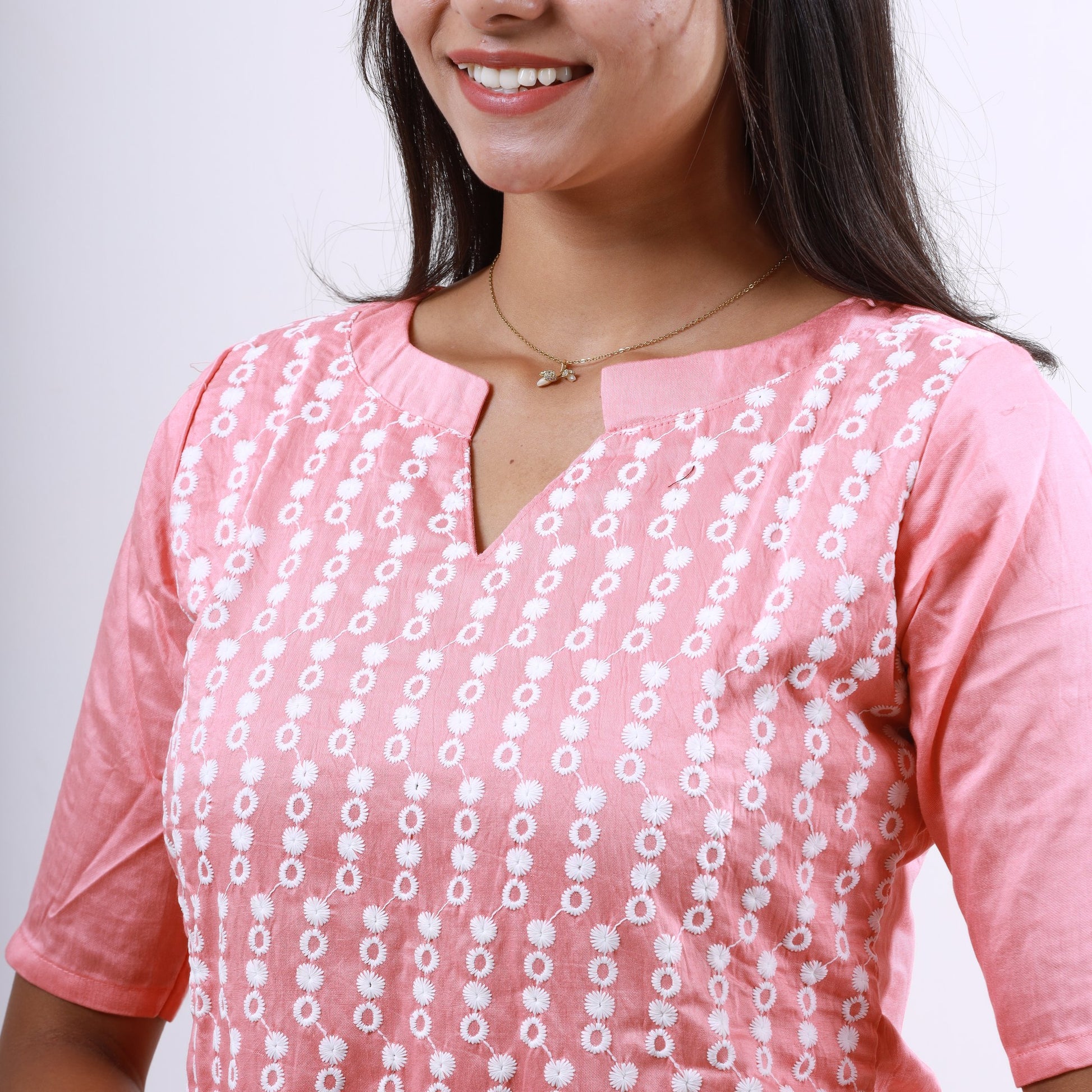 A breezy cotton Chikankari set in soft pink, beautifully embroidered and tailored for comfort—ideal for casual ethnic days or subtle festive dressing.