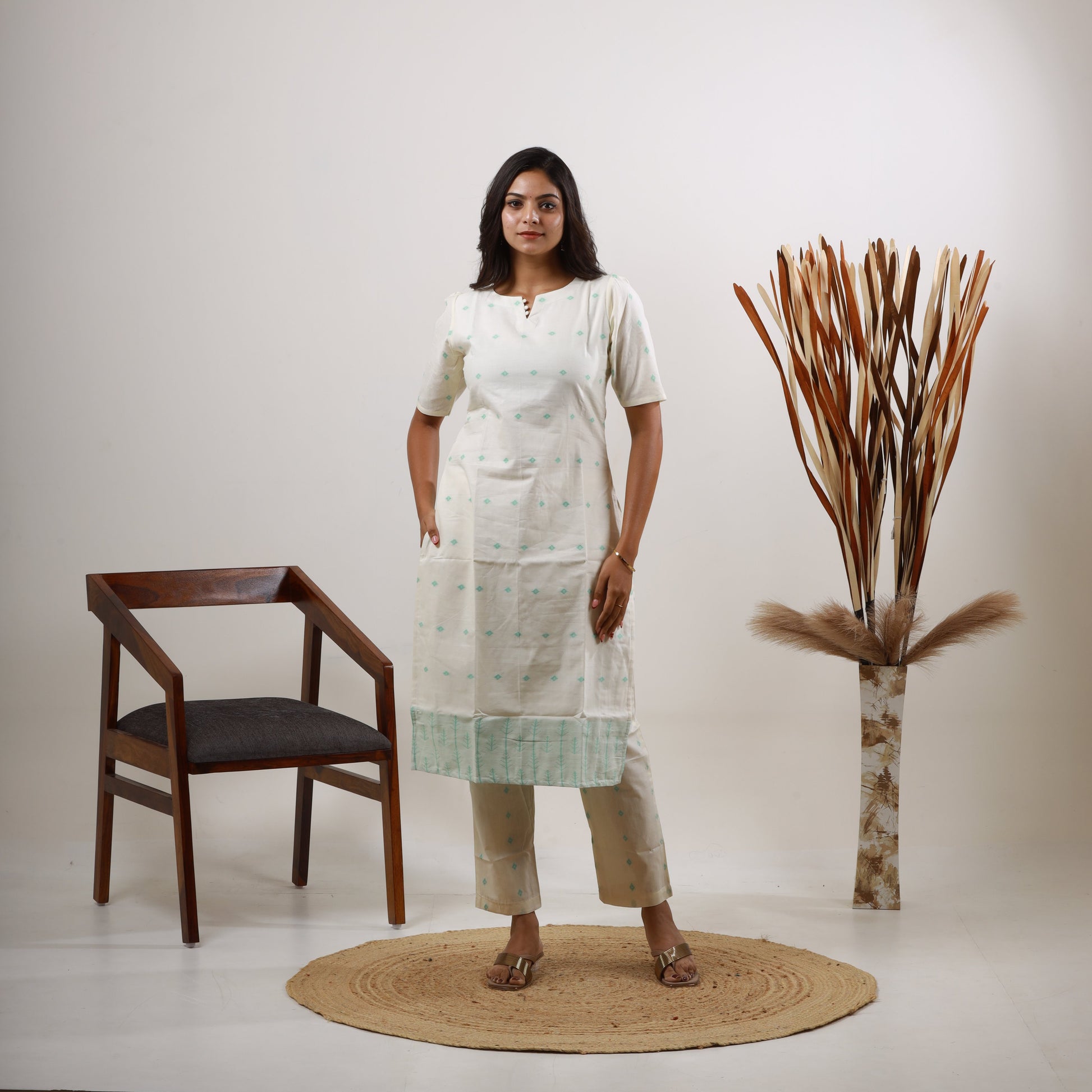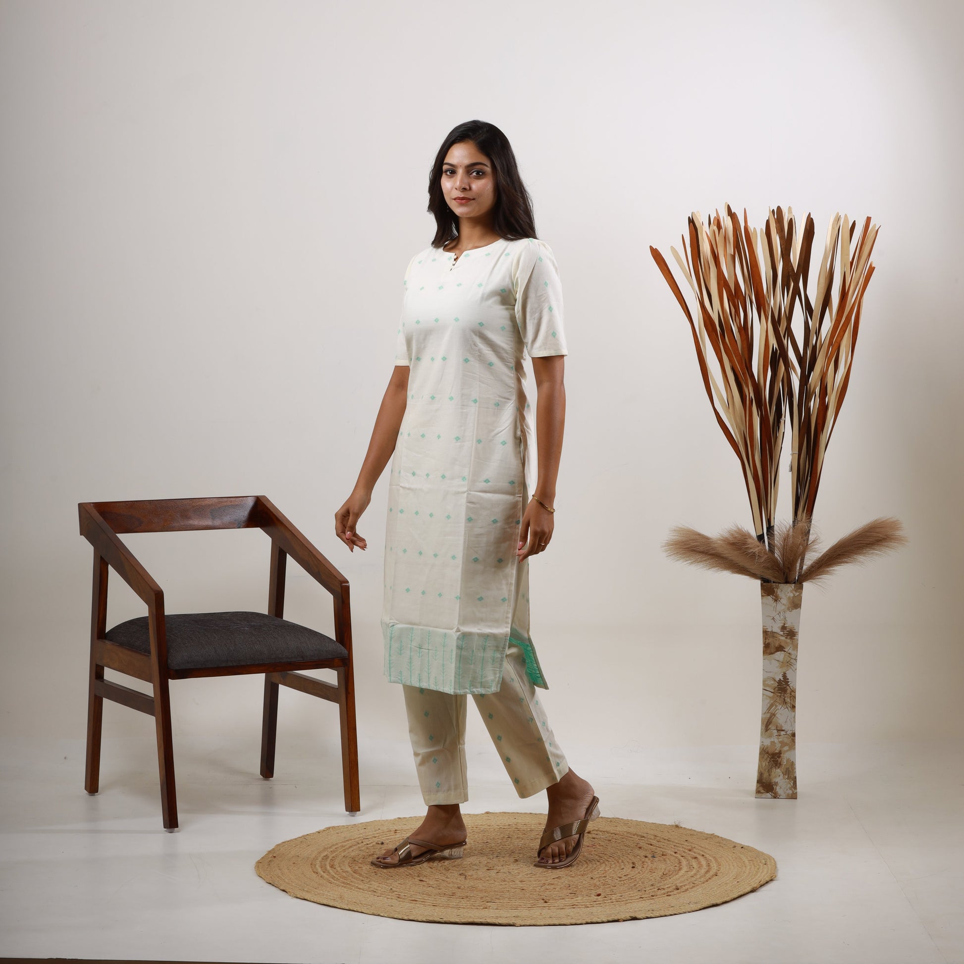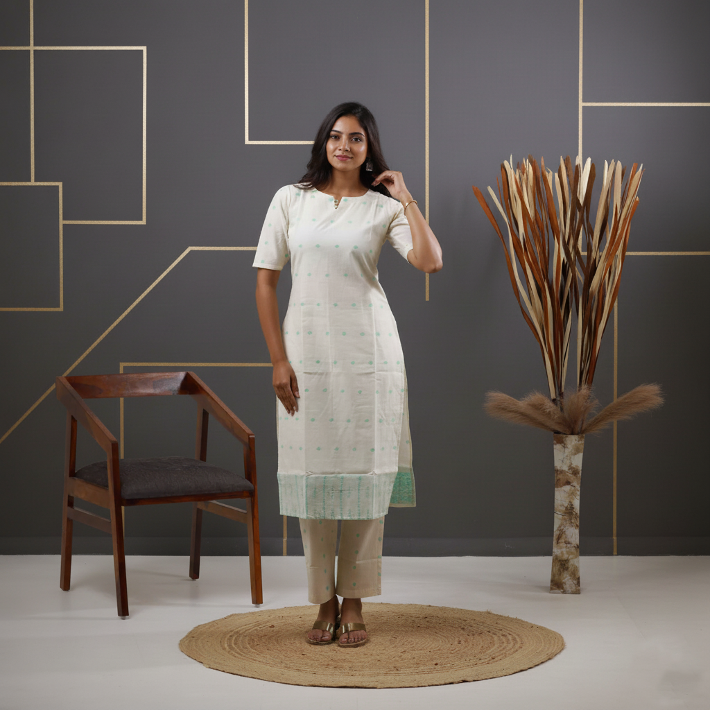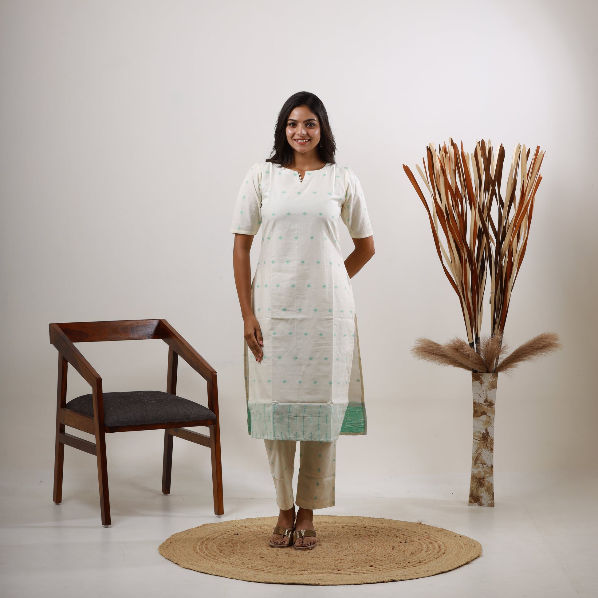 Featuring traditional butta prints in a fresh green hue, this cotton set is perfect for a graceful everyday ethnic look.