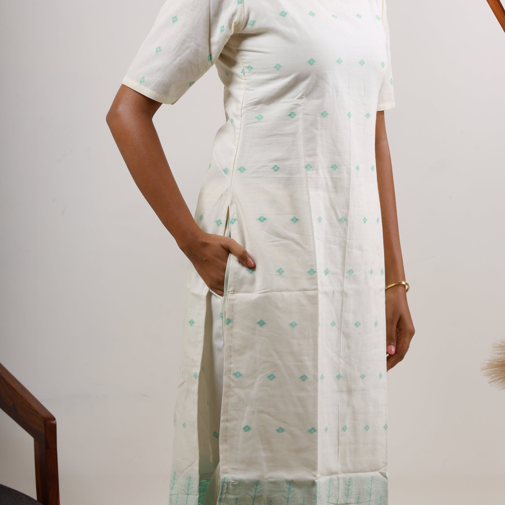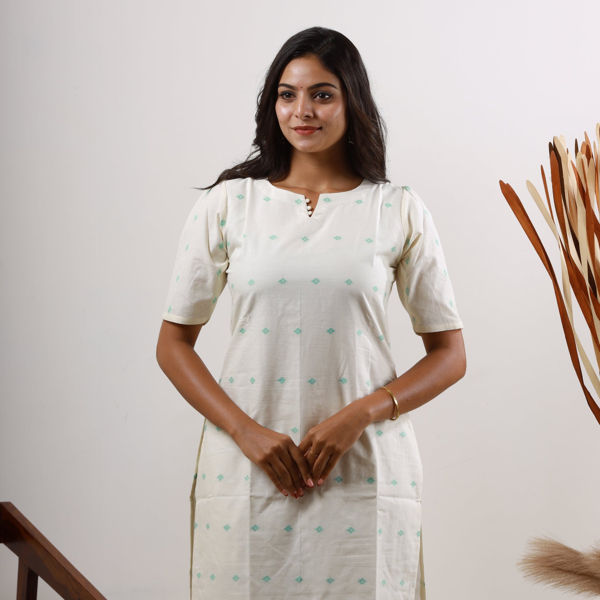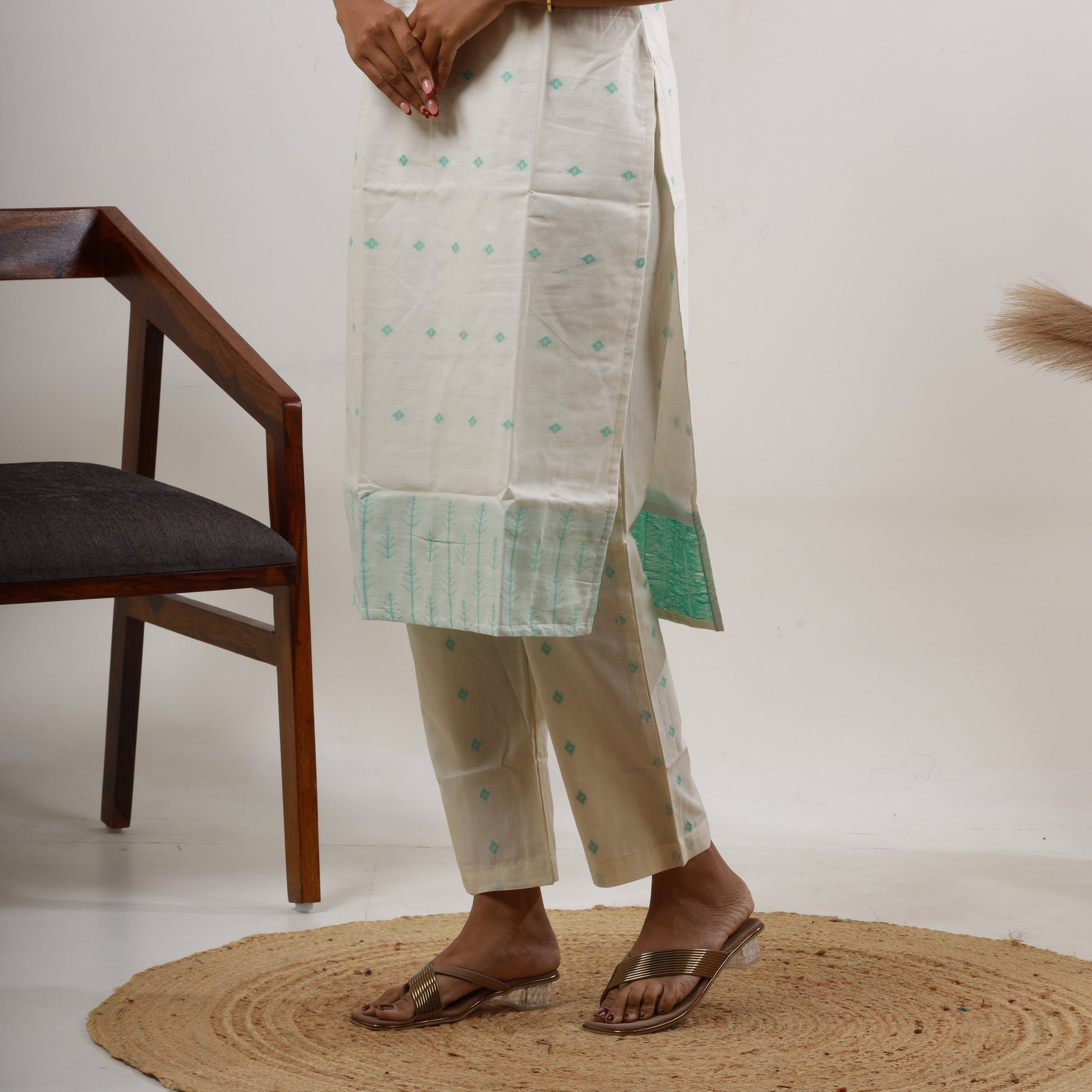 Featuring traditional butta prints in a fresh green hue, this cotton set is perfect for a graceful everyday ethnic look.